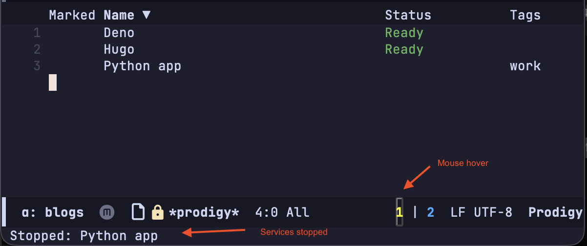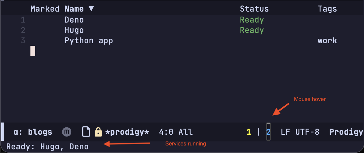 One thing missing in Prodigy is that it doesn’t show any modeline indicators. What I wanted was to be able to quickly find which services were running and which ones were stopped. This was going to be too much information to be displayed on the modeline, so I instead wanted just the number of services running vs stopped, and I wanted them to be color coded (green for running, blue for ready, yellow for stopped, etc.) And on hover, I wanted the respective service names to be displayed in the echo area.